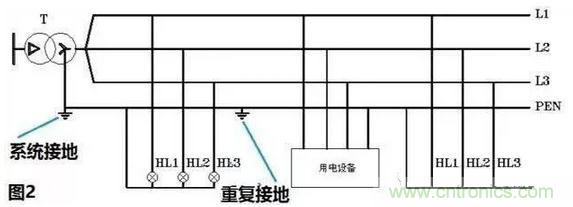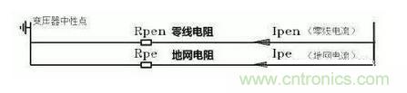 在这样的供电系统中地线和零线合二为一称之为PEN线,值得注意的是这种系统中的PEN线需要在配电网中重复接地形成一个接地网,以保证PEN线的零电位。