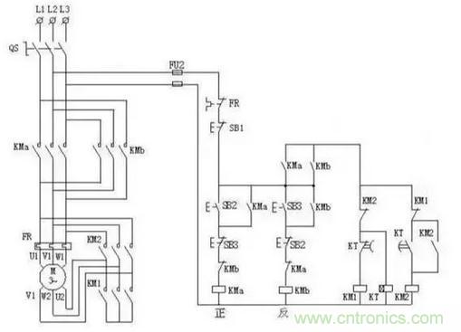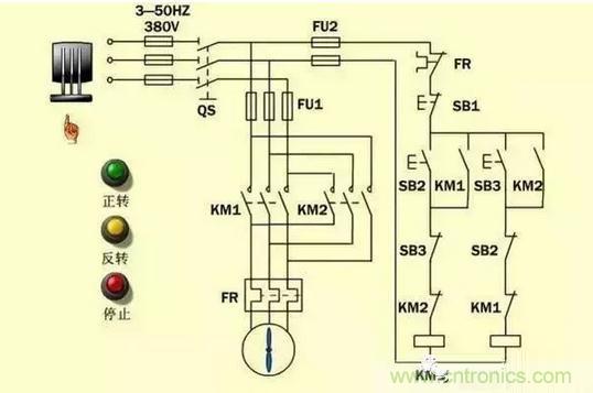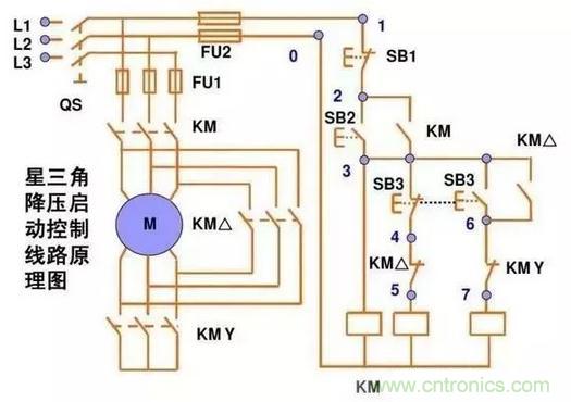 星三角我上图分析过了,控制电机正反转也分析过了。两图合一就是这个图了,喜欢的朋友可以自己学着分析一下。