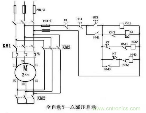 带延时继电器的星三角更加方便,接线和上图的手动控制类似,只不过把按钮开关换成了延时继电器。按钮开关SB2按下去以后KM1自锁,同时延时继电器的线圈得电启动,延时继电器KT常闭点串KM2线圈,KT??愦甂M3线圈,延时时间到了以后KM3自锁。KM3的辅助常闭点串延时继电器的线圈,所以启动完成后,延时继电器也会断电。