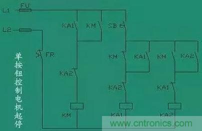 这个电路没有太大的实用性,但是非常适合学习。2个中间继电器和一个交流接触器,我们看一下电路,2个继电器互锁,KA1的线圈串KM的辅助常闭点,KA2的线圈串KM的辅助常开点。所以按下SB按钮开关KA1自锁,同时KA1的??惚蘸螷M自锁,实现了启动操作。然后再按下SB按钮开关,KA2又会自锁,KA2的常闭点会断开,而KA2的常闭点是串的KM的线圈,所以同时KM线圈失电,实现停止操作。