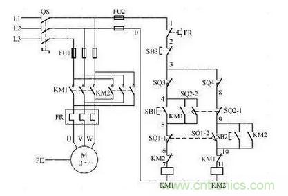 这个电路也很经典,其实它是控制电机正反转的加强版。利用行程开关实现自动往返的效果,按下SB1启动按钮KM1自锁,小车开始正向走,当碰到限位开关SQ1时,KM1线圈失电KM2自锁,小车又反向运行。只要不按下SB3这个停止按钮,它就会循环运行。