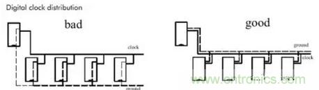 时钟线是对EMC 影响最大的因素之一。在时钟线上应少打过孔,尽量避免和其它信号线并行走线,且应远离一般信号线,避免对信号线的干扰。同时应避开板上的电源部分,以防止电源和时钟互相干扰。