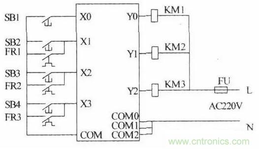 在PLC的I/O接线图中有许多行程开关和转换开关,以及压力继电器、温度继电器等,这些电器元件没有吸引线圈,它们的触点的动作是依靠外力或其他因素实现的,因此必须先把引起这些触点动作的外力或因素找到。其中行程开关由机械联动机构来触压或松开,而转换开关一般由手工操作,从而使这些行程开关、转换开关的触点在设备运行过程中便处于不同的工作状态,即触点的闭合、断开情况不同,以满足不同的控制要求,这是看图过程中的一个关键。