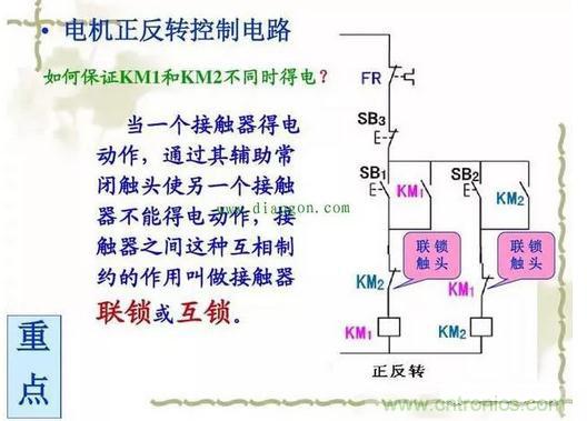 交流接触器KM1的常闭触点串联在交流接触器KM2线圈回路中,相应的,交流接触器KM2的常闭触点也串联在交流接触器KM1线圈回路中,说白了,这两个交流接触器不能同时工作。