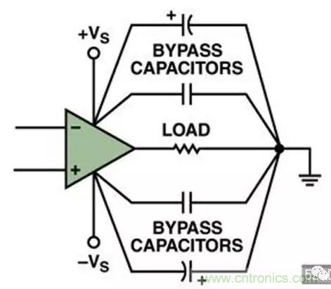 这种方法在大多数情况下都是最有效的,採用多个并联电容器将运算放大器的电源引脚直接接地。一般说来两个并联电容就足够了,但是增加并联电容器可能给某些电路带来益处。