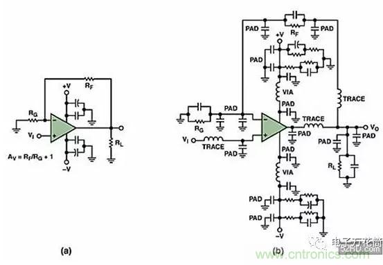 所谓寄生效应,按照字面意思就是那些出现在PCB板中并在电路中大施破坏、令人头痛且原因不明的小故障。它们就是渗入高速电路中隐藏的寄生电容和寄生电感。其中包括由封装引脚和印制线过长所形成的寄生电感;焊盘(pad)到地、焊盘到电源平面和焊盘到印制线之间形成的寄生电容;通孔之间的相互影响,以及许多其他可能的寄生效应。(图三)(a)显示一个典型的同相运算放大器原理图。但是,如果考虑寄生效应的话,同样的电路可能会变成图三(b)那样。