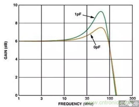 在高速电路中,很小的值就会影响电路的性能。有时候电容值几十个pF的电容就足够了。相关实例:如果在反相输入端仅有1pF的附加寄生电容,它在频率域可以引起差不多2dB的尖脉冲,如(图四)。如果寄生电容足够大的话,它会引起电路的不稳定和震盪。