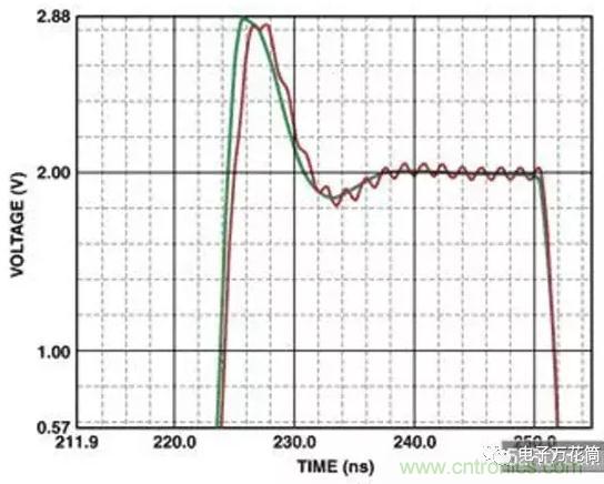 (图七)中的震盪显示高速运算放大器同相输入端长度为2.54cm的印制线的影响。其等效寄生电感为29nH(10-9H),足以造成持续的低压振荡,会持续到整个瞬态回应周期。图七还显示了如何利用接地平面来减小寄生电感的影响。