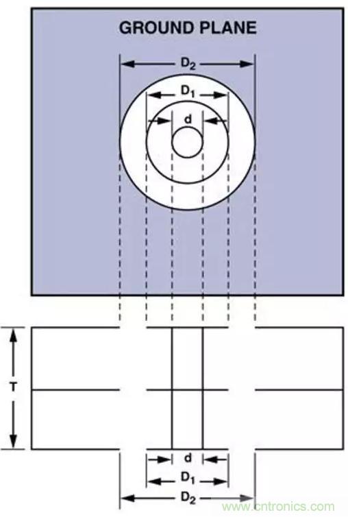 εr表示PCB材料的相对磁导率。T表示PCB的厚度。D1表示环绕通孔的焊盘直径。D2表示接地平面中隔离孔的直径。所有尺寸均以cm为单位。在一块0.157 cm厚的PCB上一个通孔就可以增加1.2nH的寄生电感和0.5pF的寄生电容;这就是为什么在给PCB佈线时一定要时刻保持警觉的原因,要将寄生效应的影响降至最小。