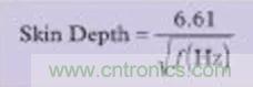 在高频段,必须考虑一种称为趋肤效应的现象。趋肤效应会引起电流流向导线的外表面,结果会使得导线的横截面变窄,因此使直流(DC)电阻增大。虽然趋肤效应超出了本文讨论的范围,这里还是给出铜线中趋肤深度(Skin Depth)的一个很好的近似公式(以cm为单位):