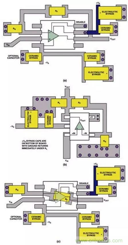 (图九) 同一运算放大器电路的佈线区别:(a)SOIC封装;(b)SOT-23封装;(c)在PCB下面採用RF的SOIC封装