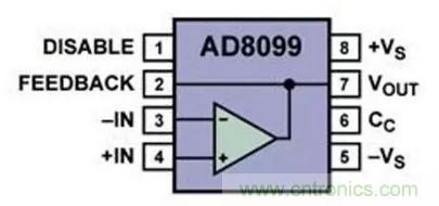 採用低失真引脚排列的一些运算放大器,有助于消除上面提及的两个问题;而且它还提高了其他两个重要方面的性能。LFCSP的低失真引脚排列,如(图十)所示,将传统运算放大器的引脚排列按着逆时针方向移动一个引脚,并且增加了一个输出引脚作为专用的反馈引脚。