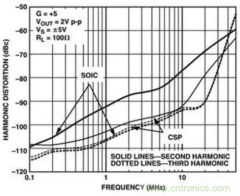 这种引脚排列还有一个好处就是降低了二次谐波失真。传统运算放大器的引脚配置中引起二次谐波失真的一个原因是同相输入和负电源引脚之间的耦合作用。LFCSP封装的低失真引脚排列消除了这种耦合所以大大地降低了二次谐波失真;在有些情况下最多可降低14dB。(图十二)显示了採用SOIC封装和LFCSP封装失真性能的差别。