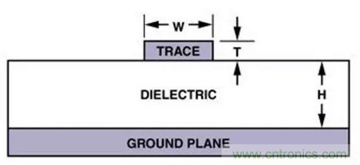 微带控制阻抗印制线,如(图十三)所示,可以用在PCB的任意一面;它直接採用其下面的接地平面作为其参考平面。