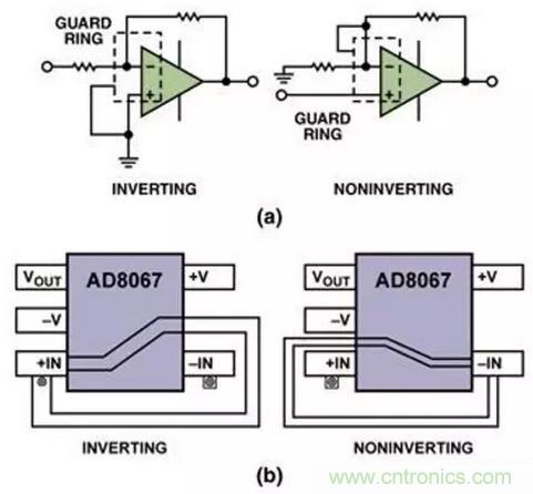 (公式七)?;せ?,或者称隔离环,是运算放大器常用的另一种遮罩方法,它用于防止寄生电流进入敏感结点。其基本原理很简单,用一条?;さ枷呓舾薪岬阃耆鹄?,导线保持或者迫使它保持(低阻抗)与敏感结点相同的电势,因此使吸收的寄生电流远离了敏感结点。(图十五)(a)显示了用于运算放大器反相配置和同相配置中保护环的原理图。图十五(b)则显示用于SOT-23-5封装中两种?;せ返牡湫蛠严叻椒ā?/div>