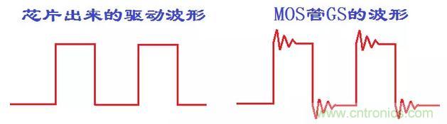 我们测试MOS管GS波形时,有时会看到下图中的这种波形,在芯片输出端是非常好的方波输出,但一旦到了MOS管的G极就出问题了,有振荡,这个振荡小的时候还能勉强过关,但是有时候振荡特别大,看着都教人担心会不会重启。