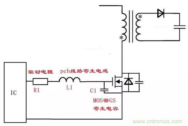 IC出来的波形正常,到C1两端的波形就有振荡了,实际上这个振荡就是R1,L1和C1三个元器件的串联振荡引起的,R1为驱动电阻,是我们外加的,L1是PCB上走线的寄生电感,C1是mos管gs的寄生电容。