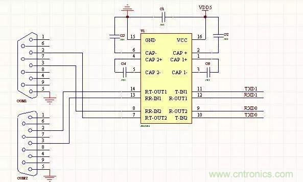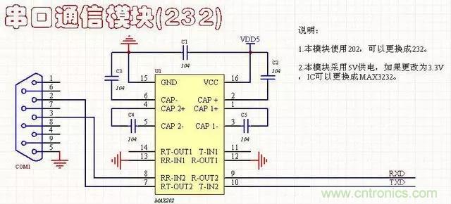 1、双路232通信电路3线连接方式,对应的是母头,工作电压5V,可以使用MAX202或MAX232.