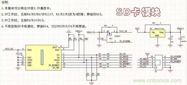 6、SD卡??榈缏罚ù┍镜缏酚隨D卡的封装有关,注意与封装对应。此电路可以通过端口控制SD卡的电源,比较完善,可以用于5V和3.3V。但是要注意,有些器件的使用,5V和3.3是不一样的。
