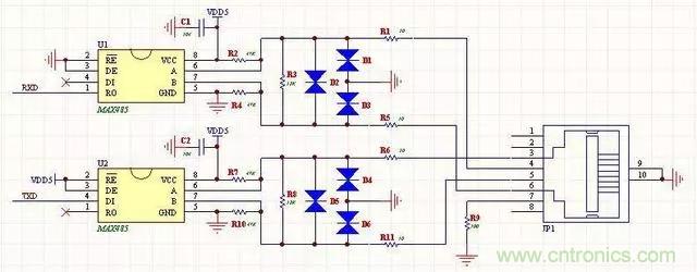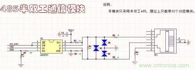 9、全双工RS485电路(带保护功能)带有?;すδ?,全双工4线通信模式,适合远距离通信用。