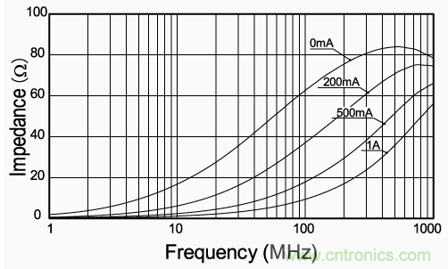 图1是电流通过片状铁氧体磁珠时的阻抗值的变化示例。
