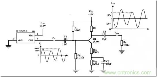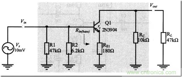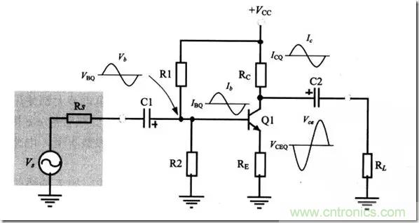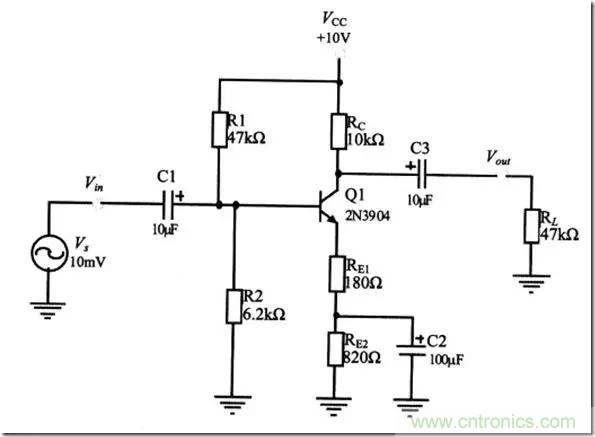 上图是基极分压式共射极放大电路,更为常用的电路图如下图所示:(图中各参数值可以不用理会,仅作说明)