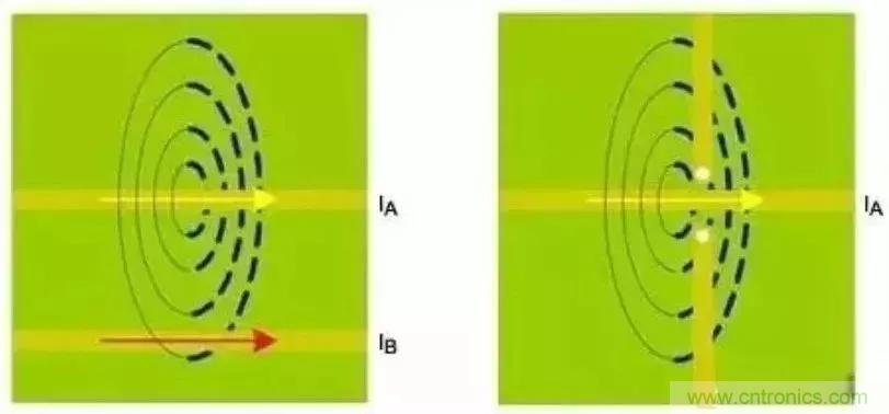 直流电流总是倾向于沿着低阻通路流通。同理,高频电流也是优先流过最低电阻的通路。所以,对于地层上方的标准PCB微带线,返回电流试图流入引线正下方的接地区域。按照上述引线耦合部分所述,割断的接地区域会引入各种噪声,进而通过磁场耦合或汇聚电流而增大串扰(图7)。