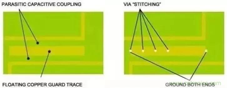 填充地也称为?;は?,通常将其用于电路中很难铺设连续接地区域或需要屏蔽敏感电路的设计(图8)。通过在引线两端,或者是沿线放置接地过孔(即过孔阵列),增大屏蔽效应。请不要将保护线与设计用来提供返回电流通路的引线相混合,这样的布局会引入串扰。