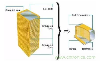 片式多层陶瓷电容器(MLCC),由内电极、陶瓷层和端电极三部分组成,其介质材料与内电极以错位的方式堆叠,然后经过高温烧结烧制成形,再在芯片的两端封上金属层,得到了一个类似于独石的结构体,故MLCC也常被称为“独石电容器”。