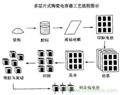 MLCC制造的工艺流程:以电子陶瓷材料作为介质,将预制好的陶瓷浆料通过流延方式制成要求厚度的陶瓷介质薄膜,然后在介质薄膜上印刷内电极,并将印有内电极的陶瓷介质膜片交替叠合热压,形成多个电容器并联,并在高温下一次烧结成一个不可分割的整体芯片,然后再芯片的端部涂覆外电极浆料,使之与内电极形成良好的电气连接,形成MLCC的两极。