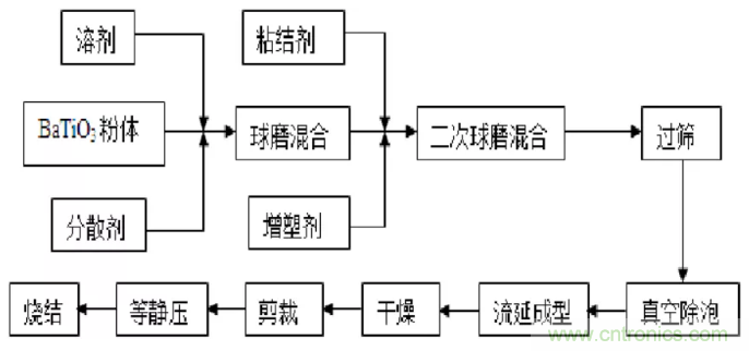从图3的工艺流程可以看出,MLCC的生产与陶瓷粉体息息相关,而其中涉及的包括电介质陶瓷瓷粉的制备、流延成膜陶瓷膜的薄膜化以及陶瓷粉料与金属共同烧结技术,都将极大影响最终MLCC的品质。接下来我们简要介绍这几项技术。