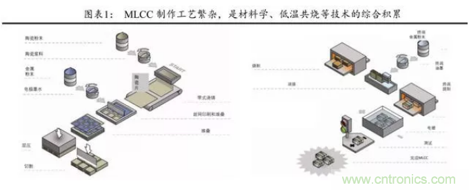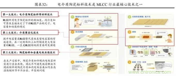 电介质陶瓷粉料 的材料技术、介质薄层化技术、陶瓷粉料和金属电极的共烧技术被誉 为 MLCC 行业最核心的三大技术。
