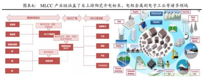 MLCC产业的下游几乎涵盖了电子工业全领域,如消费电子、工业、通信、汽车及军工等。