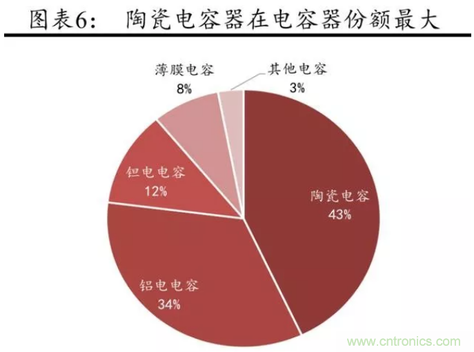 据中国产业信息网 2017年 5 月报道,陶瓷电容器在包括铝电解电容 器、钽电解电容器及薄膜电容器在内的四类主要电容器中市场份额最高,达到约43%,是当前生产规模最大、发展最快的片式元器件之一。