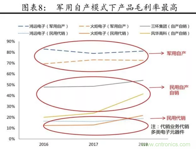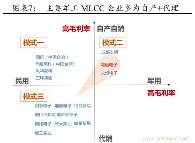 自产自销模式中,在军用领域,MLCC 因主要采用定制供应商目录的管理模式,且需要获得一系列严格的资质审查,且军用高可靠 MLCC 对产品性能、可靠性及供货稳定性有着更高或更特殊的要求等,具有较高的市场壁垒,毛利率水平一般可以达到 70%~80%,代表厂商有鸿远电子、火炬电子等,显著高于民品。