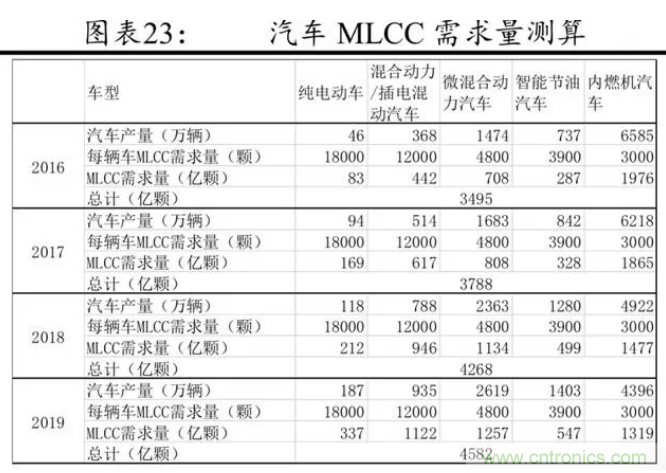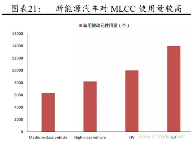 电动汽车对 MLCC 元件的需求量巨大,其中动力系统带来的MLCC增量较为显著。据前瞻研究院的数据,每辆汽车使用的电子元件,中端车平均为 6300 个,高端车为 8200 个,纯电动汽车增加到14000个,其中有一半是 MLCC,这意味着随着新能源汽车的不断普及,MLCC 需求量会不断增长。