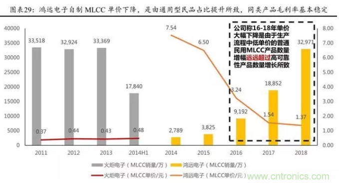从各企业生产 MLCC 价值量看,2014H1 火炬电子生产陶瓷电容 器平均单价为 0.46 元, 而鸿远电子 2014 年MLCC平均单价为 7.54 元,近几年呈现下降趋势, 我们判断,整体主要是因为自制部分通用型民品的数量占比略有提升。