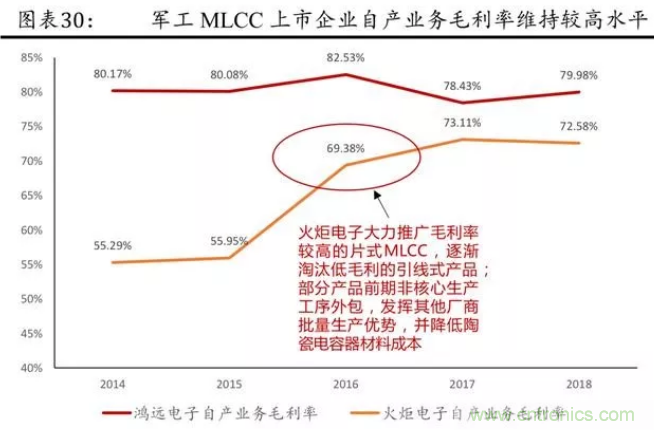 考虑18年MLCC涨价潮影响,2017 年鸿远电子及火炬电子主要供应军品 的陶瓷电容器(主要是 MLCC)产品的毛利率分别为78.96%、73.11%, 较风华高科片式电容器毛利率高 54pct、48pct。