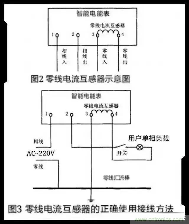 这种智能计量装置采用微处理器和专门用于电能计量的芯片。它具有功能完善、计量精度高等等特点。而对于单相220V的用电用户来说,现在的智能电能表在其内部结构中都已经安装了“零线电流互感器”。为了提高智能电能表的技术防护能力,在电源进、出相线短接的情况下,它能够检测流过电能表的零线回路中的电流。而且国家电网在技术规范要求中明确提出,所有的智能电能表都必须安装有零线电流互感器测量、记录的功能。请看下图所示