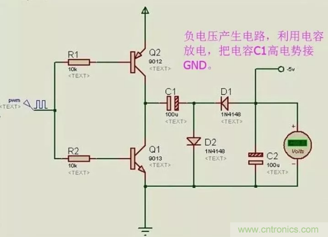 一个负电压产生电路:利用电容充电等效出一个新电源,电容串联在GND后,等效为电源2。则产生负电压。