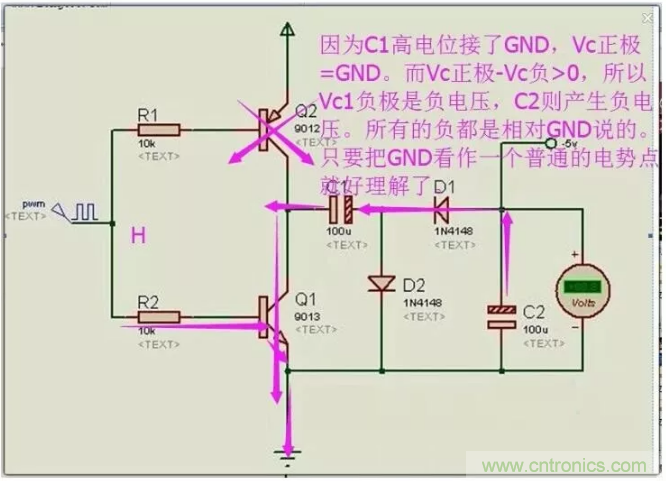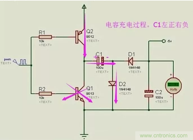 3、电容C1作为电源,C1高电势极串联在参考点。C1放电,从C2续流,产生负电压。