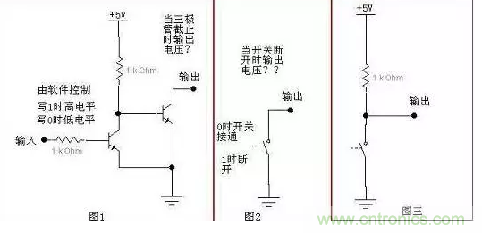 图3中那个1k的电阻即是上拉电阻。如果开关闭合,则有电流从1k电阻及开关上流过,但由于开关闭和时电阻为0(方便我们的讨论,实际情况中开关电阻不为0,另外对于三极管还存在饱和压降),所以在开关上的电压为0,即输出电平为0。如果开关断开,则由于开关电阻为无穷大(同上,不考虑实际中的漏电流),所以流过的电流为0,因此在1k电阻上的压降也为0,所以输出端的电压就是5v了,这样就能输出高电平了。