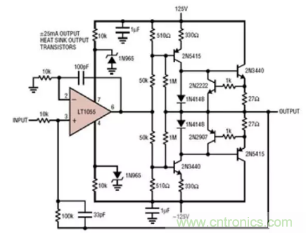 图1:为了提升运算放大器的电压输出,一种方法是为Analog Devices的LT1055等基本器件加装补偿升压晶体管,来利用运算放大器的输入特性;这种设计可输出±120V电压。(图片来源:Analog Devices)