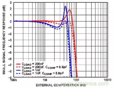 图4:在单位增益、±110V供电电压、VOUT = 100Vp-p、Rf = 0Ω 及 CCOMP = 5.6皮法 (pF) 时,ADHV4702-1的小信号频率响应与外部补偿的关系曲线图。(图片来源:Analog Devices)