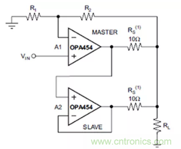 图5:将两个OPA454AIDDAR运算放大器并联,可线性提升输出电流能力。(图片来源:Texas Instruments)