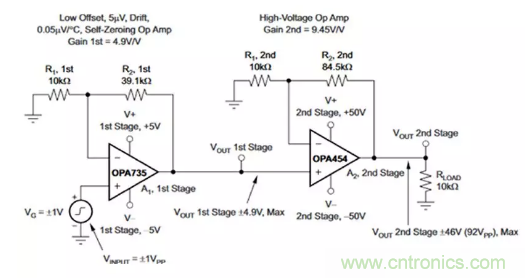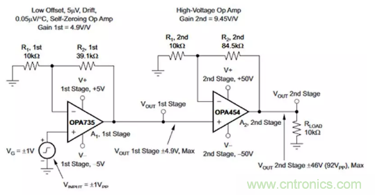 图7:在OPA454的输入路径中加装近零漂移运算放大器OPA735,会生成一个输入失调温度漂移非常低的两级高压电路。(图片来源:Texas Instruments)