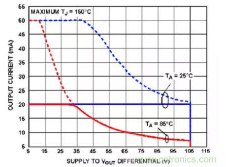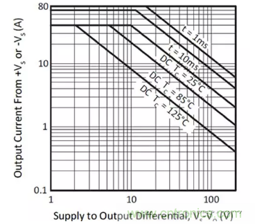 图8:研究安全工作区域 (SOA) 曲线图至关重要。ADHV4702-1的DC SOA由曲线下方的区域表示,曲线对应的环境温度分别为25°C和85°C,增益为20V,供电电压为±110伏。(图片来源:Analog Devices)