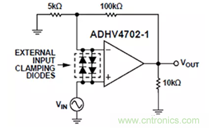 图9:在ADHV4702-1输入端接入外部二极管,可通过限制该器件的差分输入电压,?;て洳皇苌沟缏反蟮缌鞑娜刃вτ跋?。(图片来源:Analog Devices)