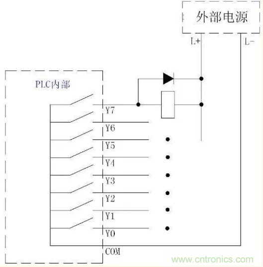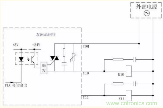 这是PLC输出电路常见的一种形式,其电路形式如下图所示。该种输出电路形式外接电源既可以是直流,也可以是交流。