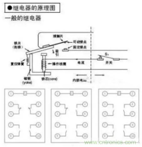 当继电器线圈施加激励量等于或大于其动作值时,衔铁被吸向导磁体,同时衔铁压动触点弹片,使触点接通、断开或切换被控制的电路。当继电器的线圈被断电或激励量降低到小于其返回值时,衔铁和接触片返回到原来位置。